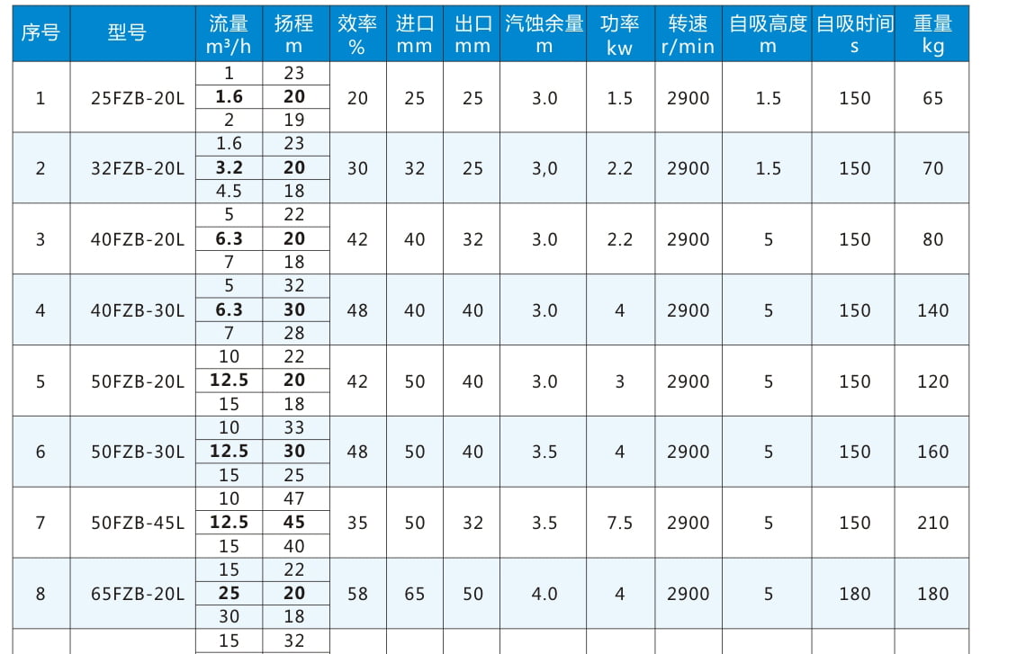 FZB:氟塑料合金自吸泵代号丨 80:进口直径80mm 丨30:扬程30米 丨L:长支架标准型